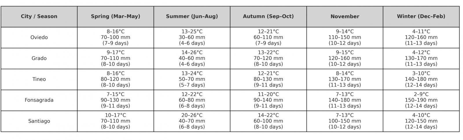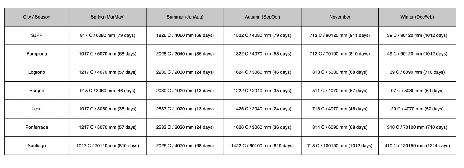 This guide provides detailed information about the climate along the main Camino routes. We go through each route and highlight the specific weather patterns for each season, along with practical advice to help you choose the best time to walk or cycle. At the end of each section, you'll find a table with approximate temperature and rainfall data for relevant towns and cities, which can support your planning.