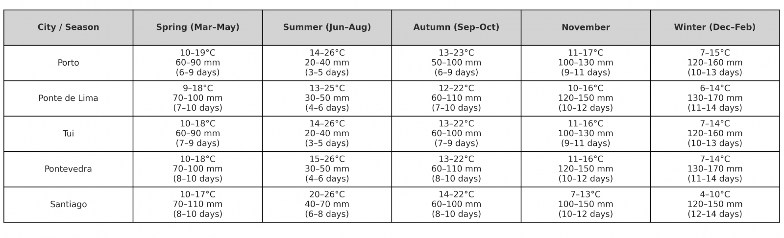 The Portuguese Way from Porto crosses northern Portugal and Galicia, two regions shaped by an Atlantic climate: mild temperatures, moderate humidity, and green landscapes. This route offers a peaceful atmosphere, charming towns, and ideal walking conditions for most of the year. Although occasional rain is possible—especially in Galicia—it also refreshes the surroundings. Ideal if you're looking for a balanced experience of nature, culture, and comfort.